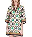 The Geo Border print is the heart of this design. Featuring intricate geometric patterns, the print masterfully uses coordinating banded trim along the split neckline, bell sleeves, and hem. This framing detail elevates the simple caftan shape, giving it a high-end, artisan finish that truly stands out.