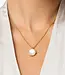 This women's designer necklace features a a delicate chain and a round, reversible pendant with golden bead accents on each side.