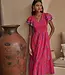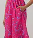This women's chic midi dress comes in a vibrant pink color with a dainty blue floral print and a V neckline that's perfect for the warmer weather.