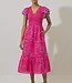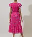 The body of the dress is smocked for a more fitted look while the skirt flares out into a flowy midi style with a ruffle hem to mirror the sleeves.