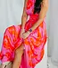 This women's designer maxi dress a vivid magenta pink and red color scheme with an elaborate, eye-catching floral print.