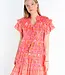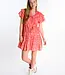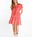 This women's designer mini dress features a ruffle hem skirt and layered ruffle sleeves, giving the dress lots of fun and flirty movement. A V-neckline with tassel ties add a charming touch to the dress.